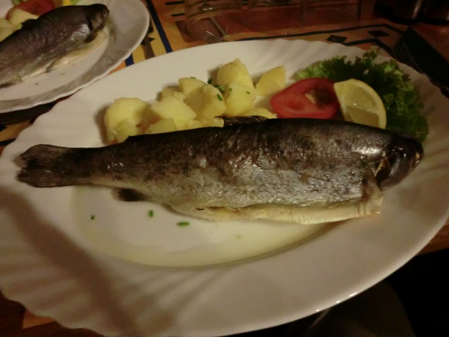 バター焼した鱒は川魚独特の風味でワインと相性が良く、美しい街のレストランで舌鼓を打つ。