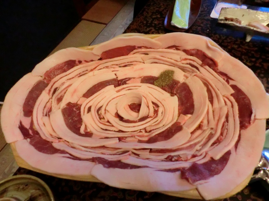 仲居さんがやって来て、赤味噌を溶いて鍋に入れ、煮えた鍋に一気に肉を全部入れた。