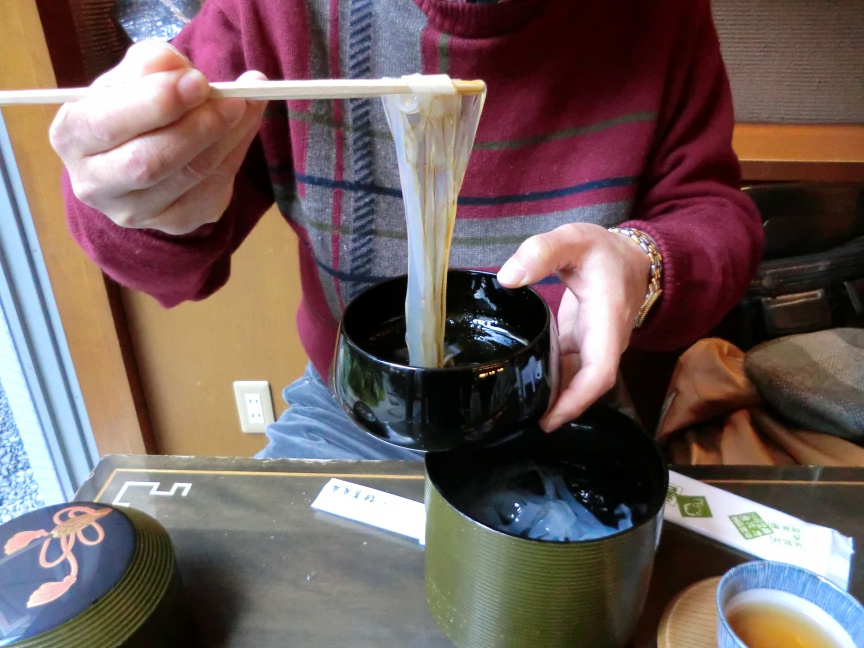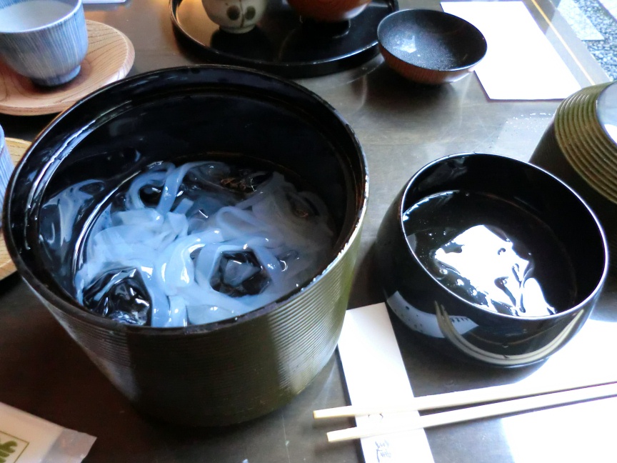 途中、人だかりの和菓子屋の茶寮に入り、奮発して「くずきり900円」を黒蜜で注文。