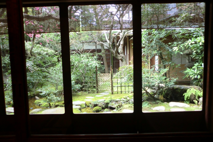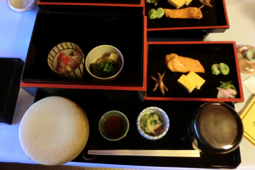 昼頃となり、八坂神社南門の下河原にある料亭「美濃幸」にて「お茶箱弁当」4,000円を頂いた。 茶箱の弁当に、茶道具一式が仕組まれた茶懐石風の京料理である。 京料理は味付けが薄いというが、確りした風味と季節の料理に上品な美味しさを感じました。