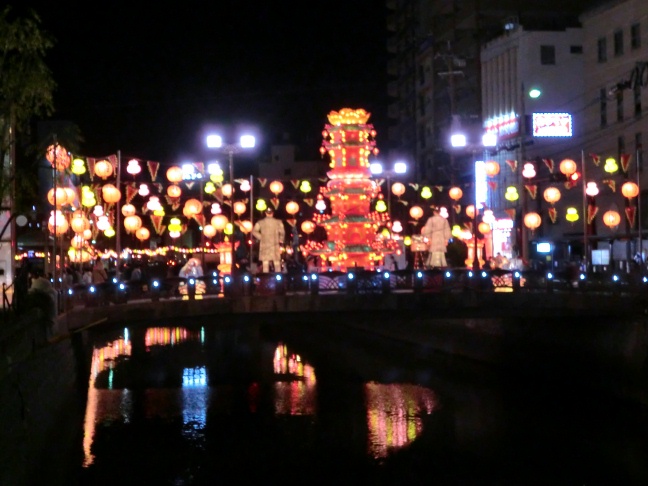 日が暮れると、会場や眼鏡橋の川筋のランタンに灯りが入り、中国の聖人や龍や鳳凰の張り子が浮立ち、幻想的な雰囲気となる。