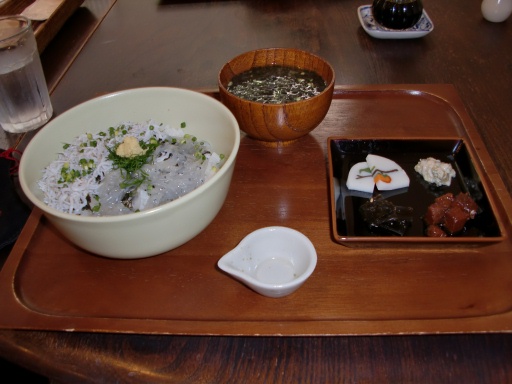 丁度昼頃に熱海に着き食堂を探すと、駅前商店街の殆どは魚の干物屋であり、干物屋「あおき」が経営する雰囲気のある干物食堂に「二色しらす丼」1100円の品書きを見て、生しらすは食べたことが無く熱海の地の味と思いこの店に入った。