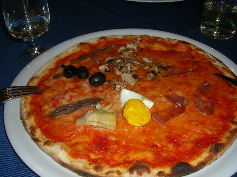 1枚のピザに、ナポリタンの具とカプリチョーザの具が半分ずつ乗ったピザで、特にアンチョビのしょっぱさがチーズと良く合い抜群に旨くワインが進み、ピザをお替りした。