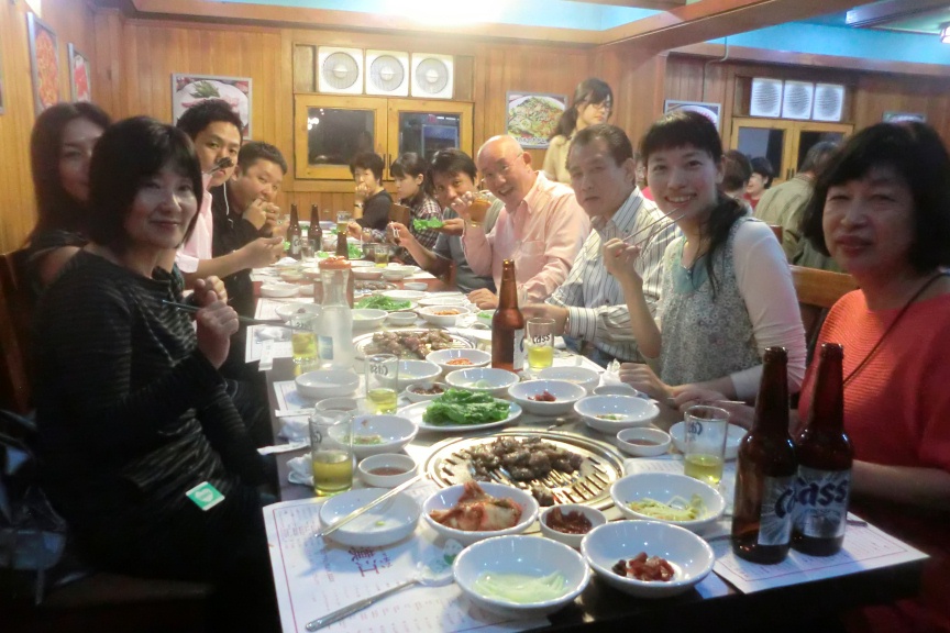 この日の夕食は韓国ならではのカルビ焼肉。野菜の葉に辛味噌を付け肉とナムルを包んで食べる。