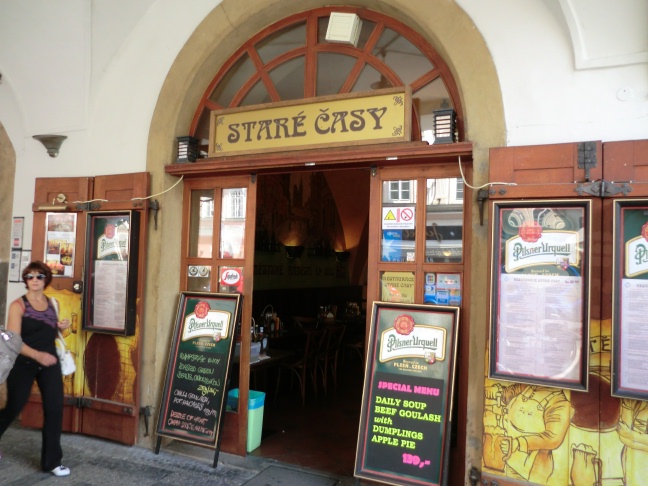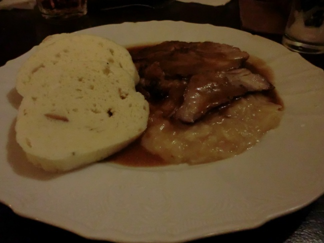 昼食はプラハの街中のレストランで、ローストポークとチェコ名物のクネドリーキを食す。