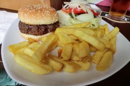 分厚いハンバーガーやポテトフライと地ビールを頂いた。