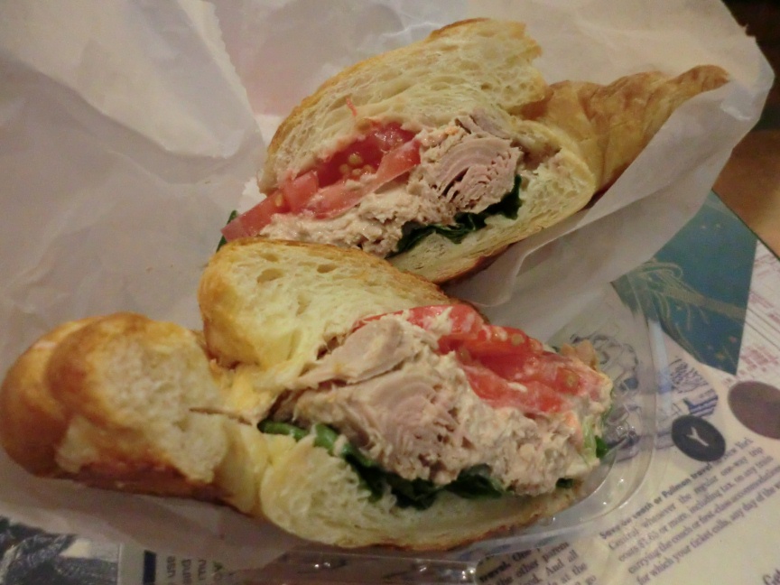 私達もビッグなチキンサンド($6)とアメリカンサイズでたっぷりのコーヒー($1.8)を頂き、ニューヨーカーになった気分だった。