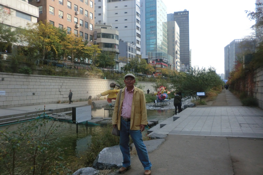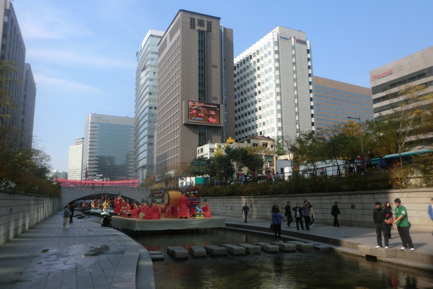 それから明洞に行く途中で、高層オフィスビルの街のど真ん中に、7キロに亘り川が流れている。