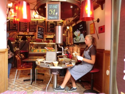 店先にソフトクリームのコーン生地を焼いているお店や土産物店、そしてヨーロッパ独特の石畳路地。