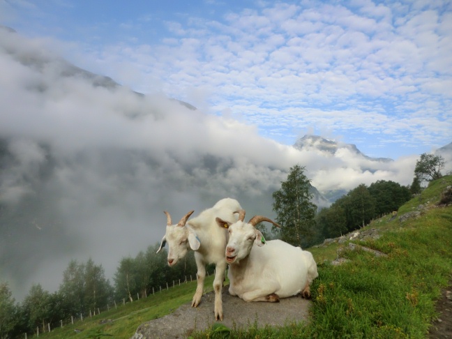 緑と透明の川、そしてパステルカラーの空と雲。山頂には放牧のヤギがのんびり休んでいる。
