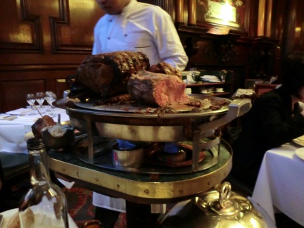 厳かに席に着き、前菜とワインを頂いていると、ローストビーフを載せたワゴンが来た。