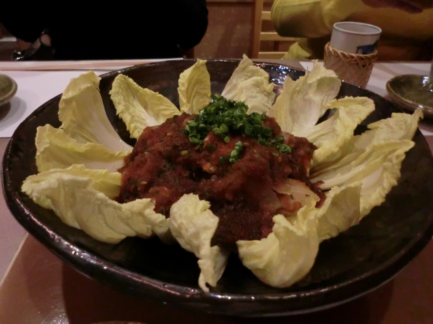 白菜の芯の柔らかい部分にフグのぶつ切りを乗せて食する。