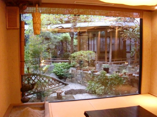 仲居さんの案内で部屋に入ると手入れされた素晴らしい中庭が窓いっぱいに見える8人位入れるような広い部屋で、3人には広すぎる部屋でした。